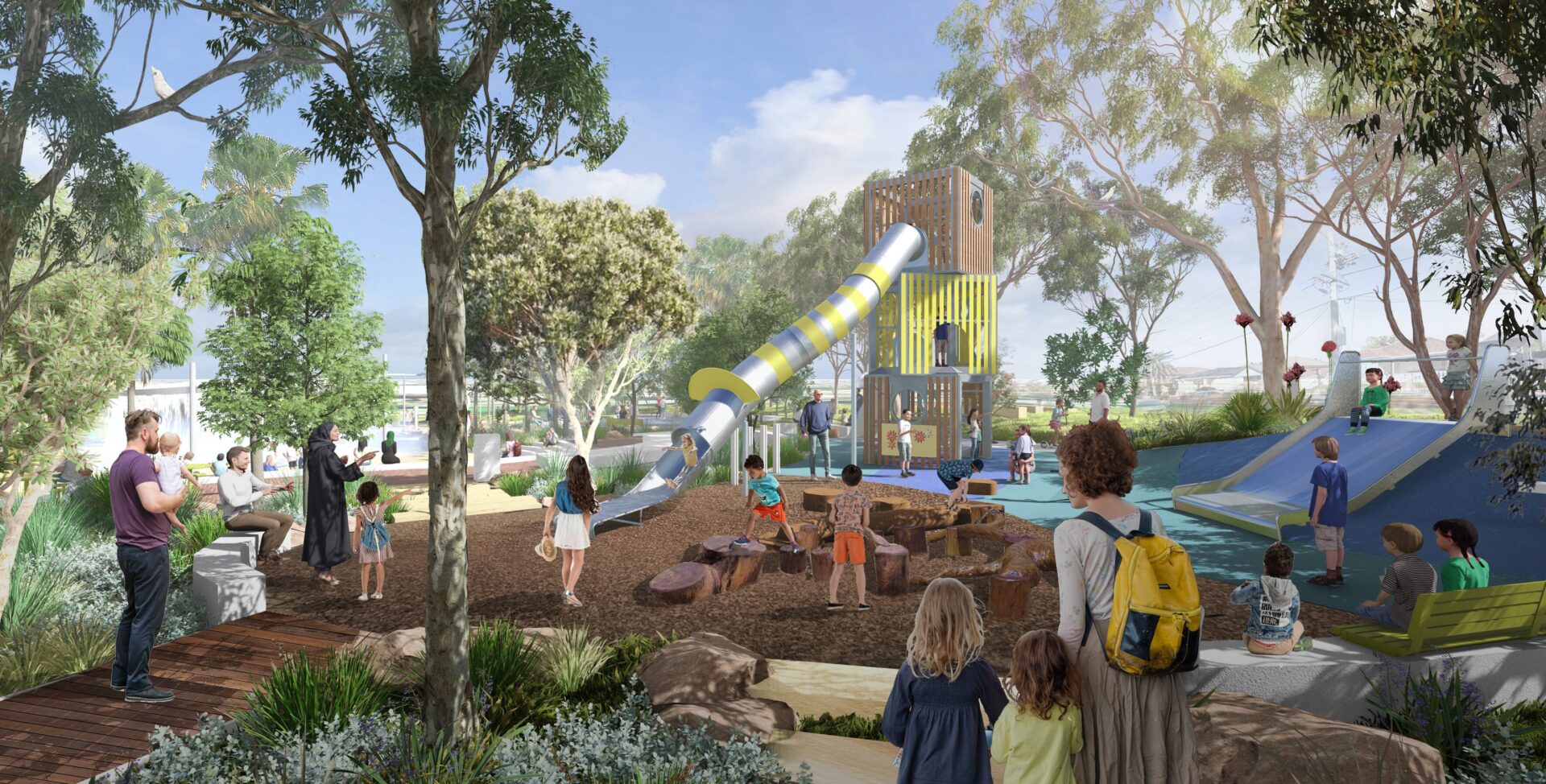 The new playspace integrates adventurous nature play with mounded slides, natural tiered seating, climbing towers, a universal carousel, accessible swings and a communal shade structure. At its centre, a sensory‑rich splash pad offers jets, misters, water pumps and a signature cascading water feature inspired by a local First Nations story about smoke transforming into rain. The enlarged water play area — named the Laurie Ferguson Splash Park — provides an exciting interactive experience for children of all ages, while new amenities like modern change facilities and toilets ensure the park remains accessible and enjoyable for everyone.