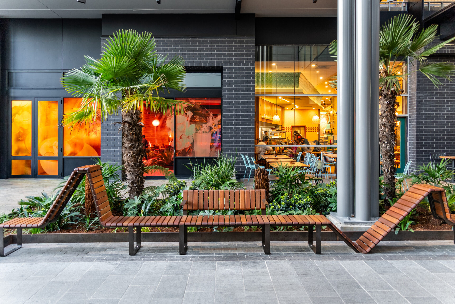 Bespoke furniture by Street Furniture Australia invites visitors to dwell, rest and play, while generous planting, gardens and public art under the overpass add warmth and identity to the urban experience.